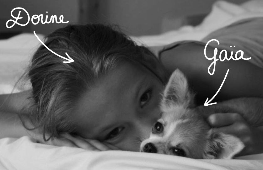 Salut ! Je m'appelle Dorine et j'ai 26 ans. Et la petite boule de poils sur la photo, c'est mon premier amour, Gaïa. Elle a rejoint les étoiles en 2021 et je tenais absolument à ce que ma marque porte son nom, pour qu'elle reste toujours auprès de moi.